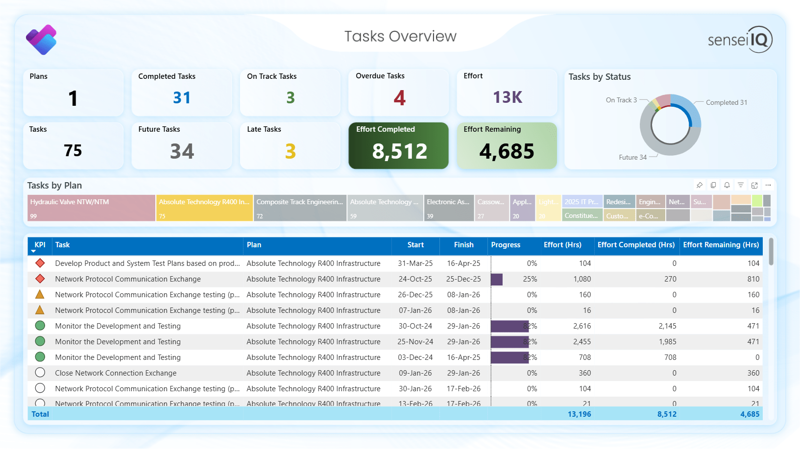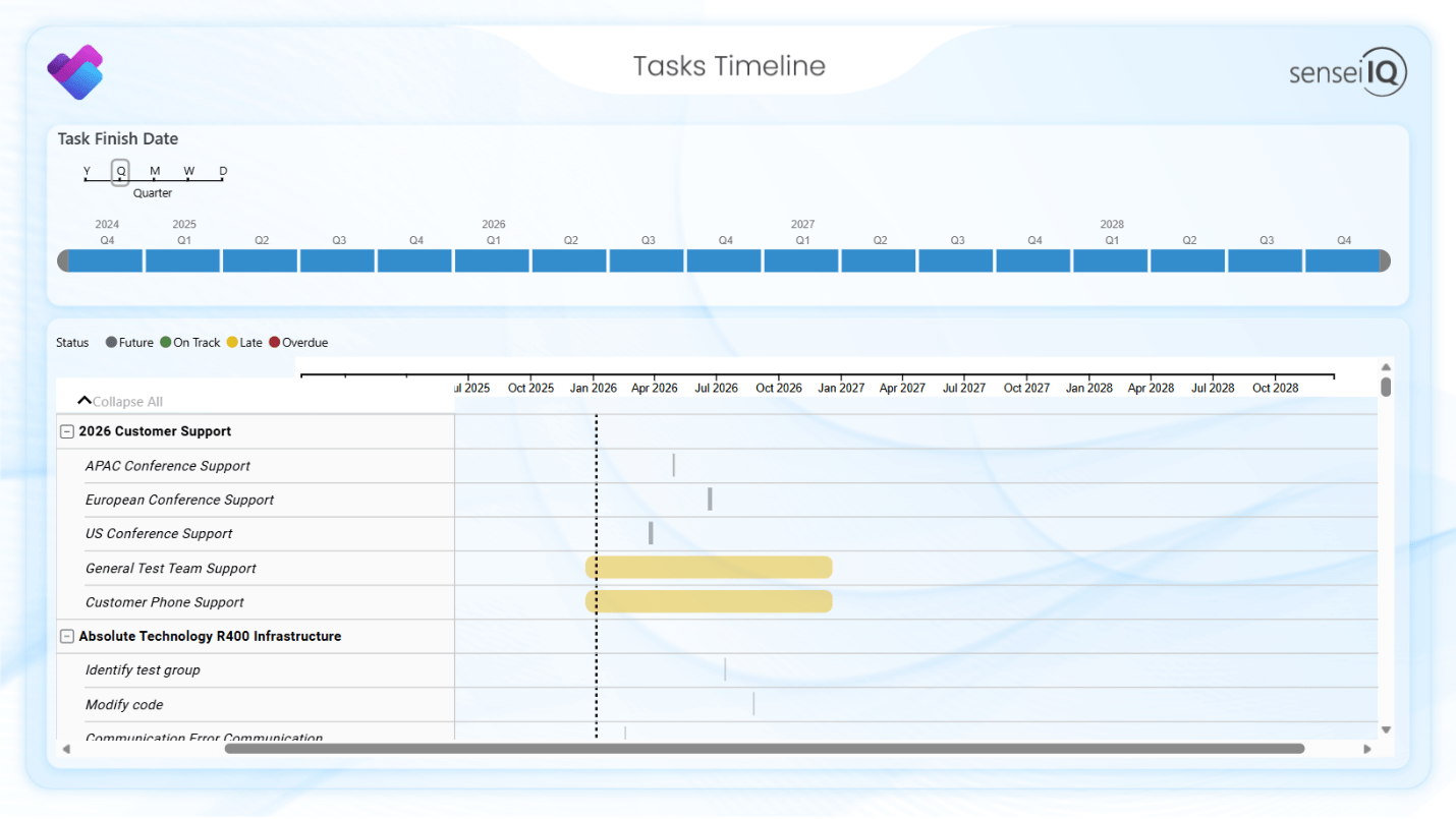 The Tasks Overview page shows every task within your plans. You can filter by status to quickly identify late and overdue tasks within a specific plan.