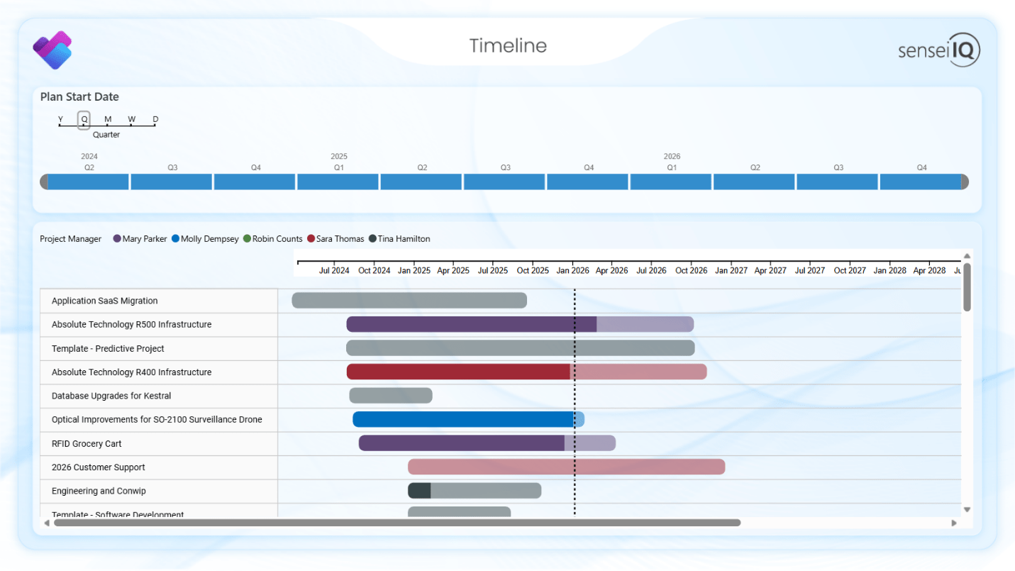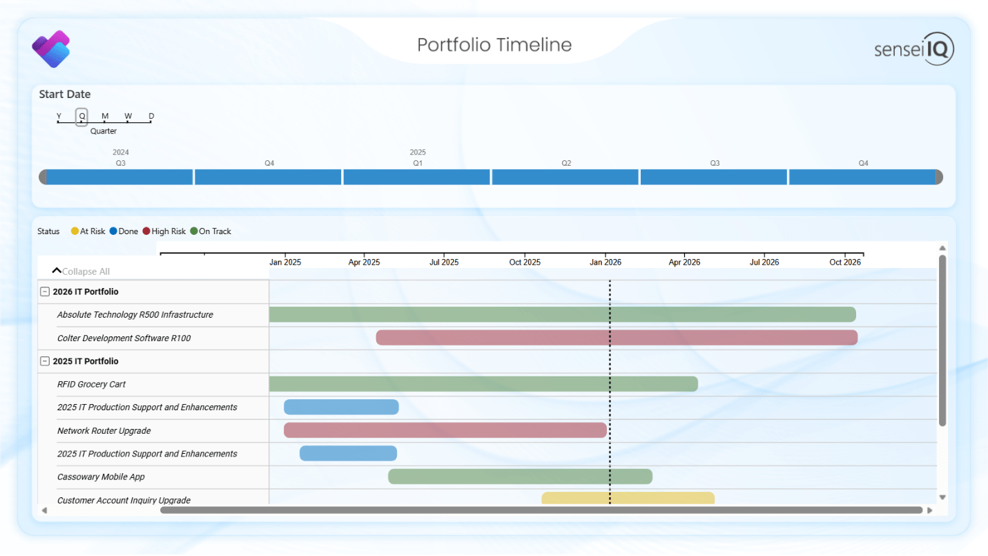 The Portfolio Timeline page shows that same timeline, but now grouped by portfolio and showing only the plans within those.