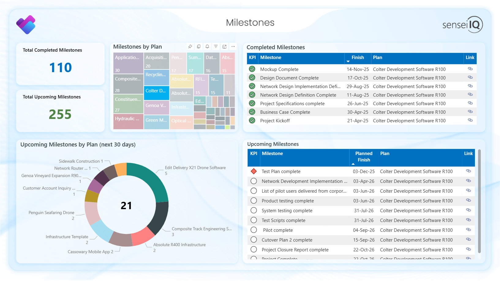 The Milestones report page pulls out the milestones from all the plans. It lets you easily see what you have completed recently and which milestones are coming up. A red KPI means the milestone is overdue, and white means it’s scheduled in the future.
