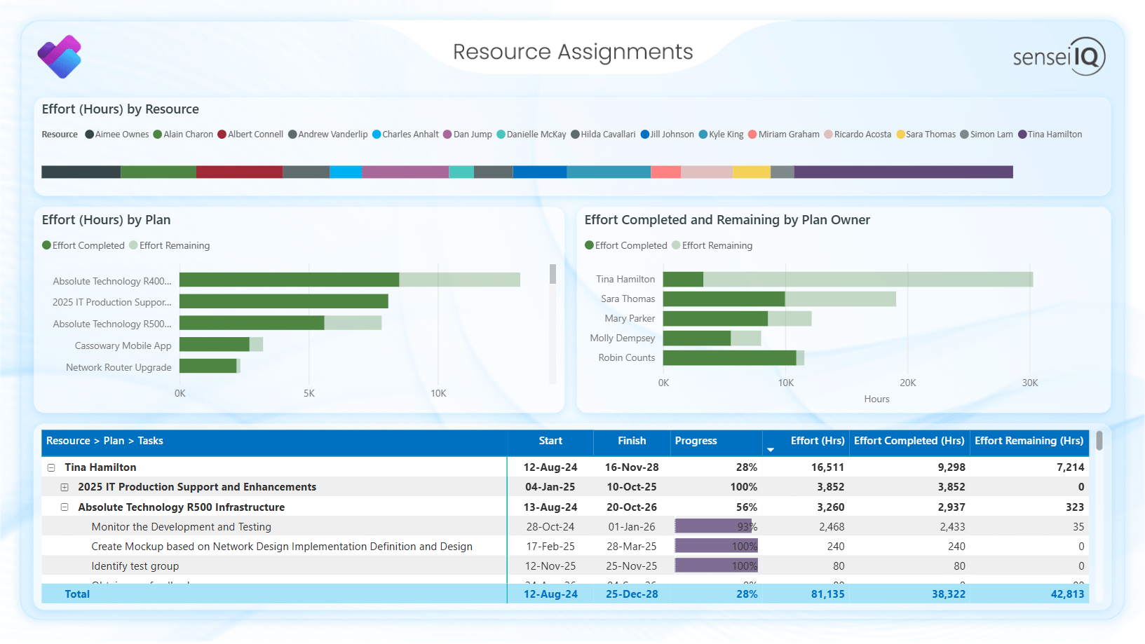The Resource Dashboard shows a high-level overview of resources and their tasks and assigned effort. You can filter to see details by plan, or filter for overdue tasks and see the plans and resources behind these.