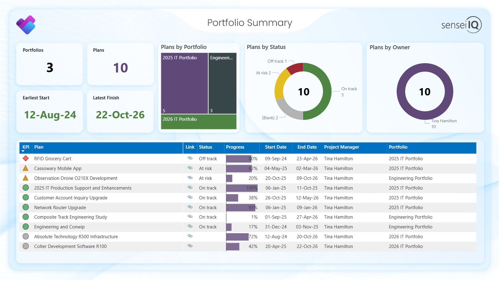 The Portfolio Summary page shows all the portfolios you have created and the plans within them. The statuses here represent what you have manually set for the plan within the portfolio.